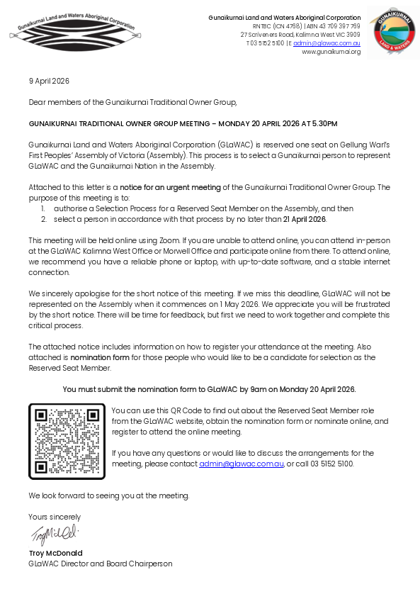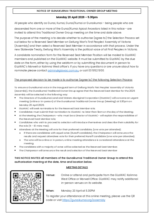 Notice of Gunaikurnai Traditional Owner Group Meeting to select GLaWAC’s Reserved Seat on the Assembly