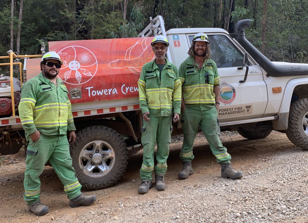 Trey Parsons (GLaWAC), Reggie Baxter (DEECA) and Bryce Baxter (GLaWAC) during their deployment to bushfires in the Orbost area in January. In the aftermath of the 2019/20 bushfires, Traditional...